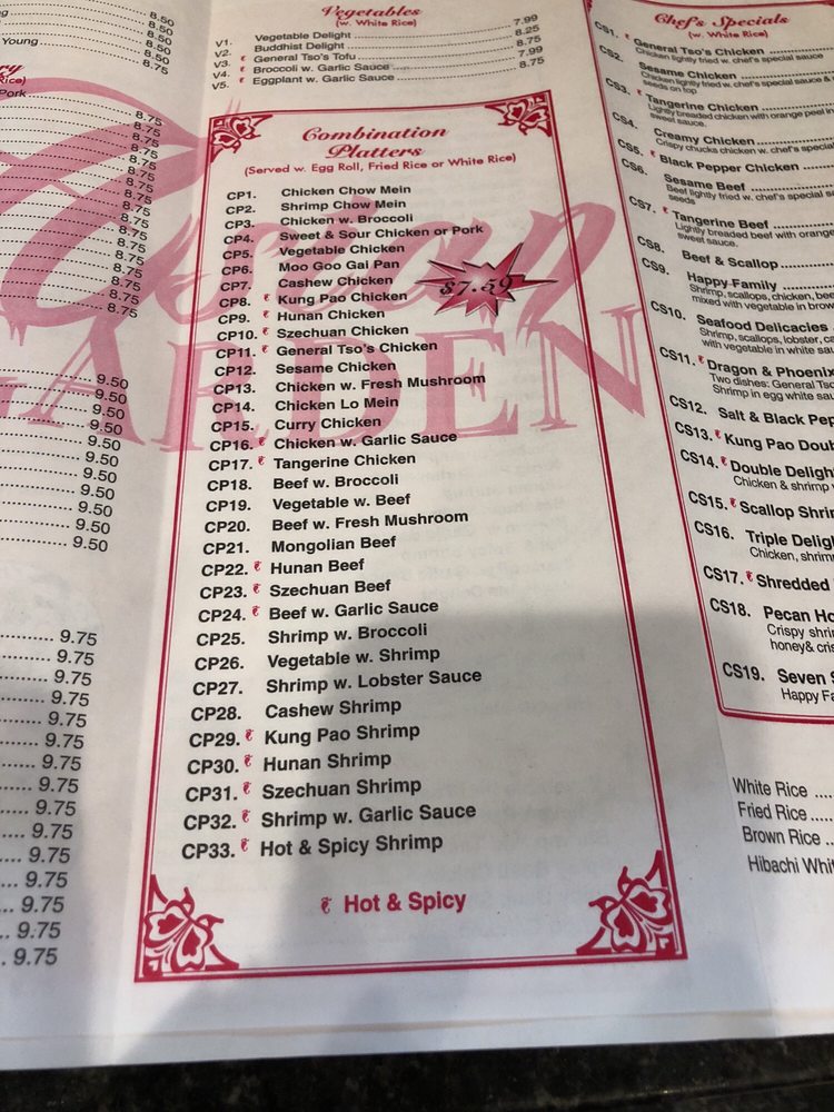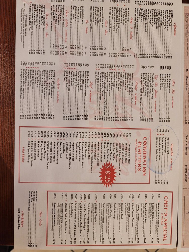 Choose two items under poultry, one item under beef and one item under seafood (except scallops). Served with white rice, egg roll and Crab Rangoon. Choice of one wonton soup, egg drop soup, hot and sour soup or salad. Our food may contain peanut, dairy, egg or shellfish products.